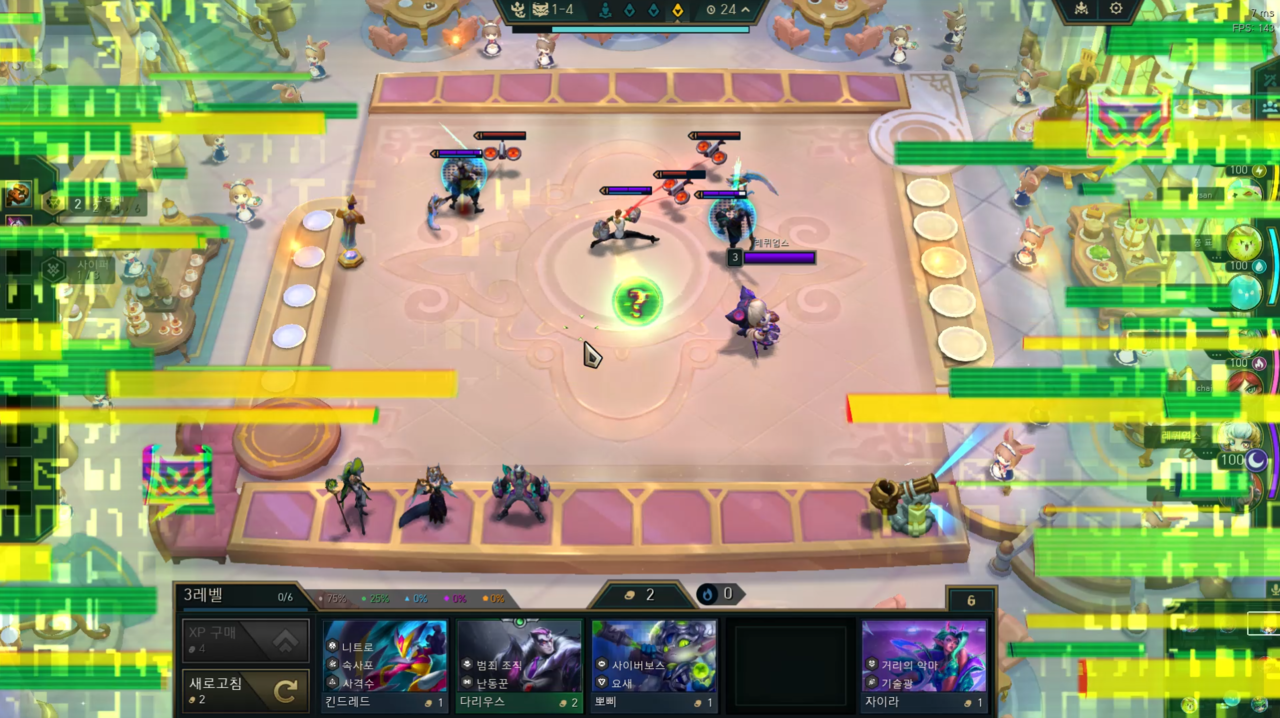이번 세트 메인 기믹은 해킹입니다. 가끔씩 화면에 초록색 노이즈가 생기며 게임 내 크고 작은 변화가 생기게 됩니다. 증강 선택 단계에서 해킹이 이뤄지면 특정 증강이 '암시장' 증강이 되면서 카테고리가 정해졌어요.
