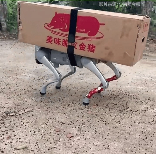 SNS에는 상자에 담긴 돼지구이를 실은 로봇개가 산을 오르는 모습의 사진도 올랐다.