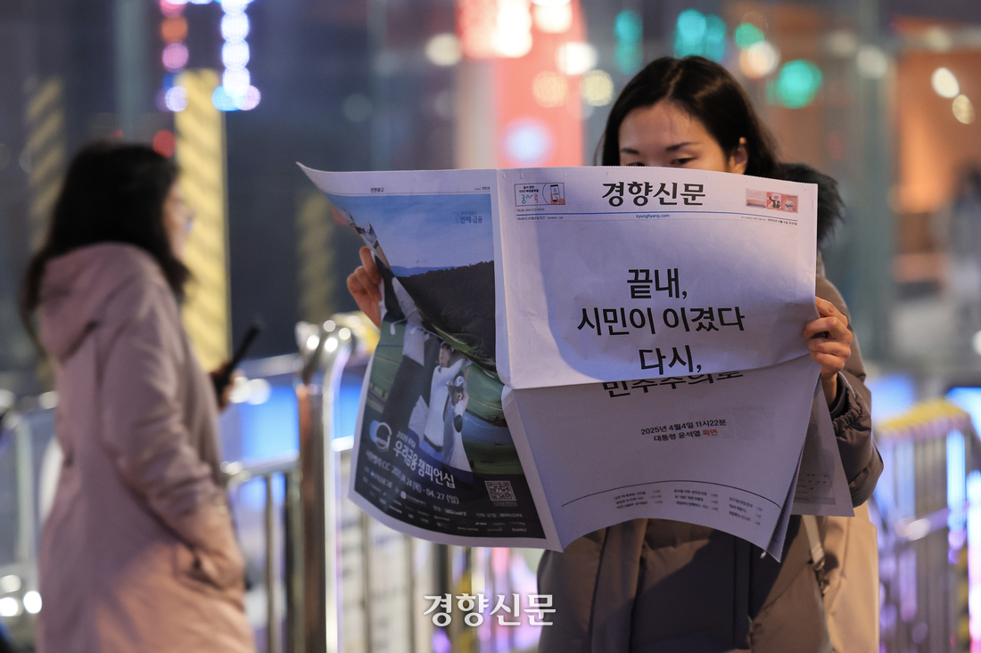 한 시민이 지난 4일 서울 지하철 1호선 시청역 인근에서 윤석열 대통령 파면을 알리는 경향신문 특별판을 읽고 있다. 이준헌 기자 |