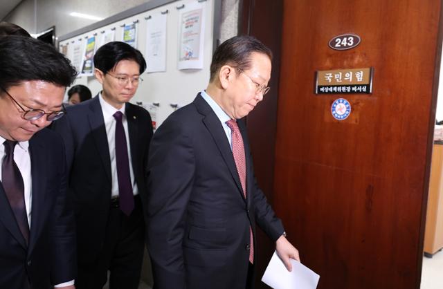 권영세 국민의힘 비상대책위원장이 4일 서울 여의도 국회에서 헌재의 윤석열 전 대통령 탄핵 인용이 발표되자 입장을 밝힌 뒤 이동하고 있다. 연합뉴스 |