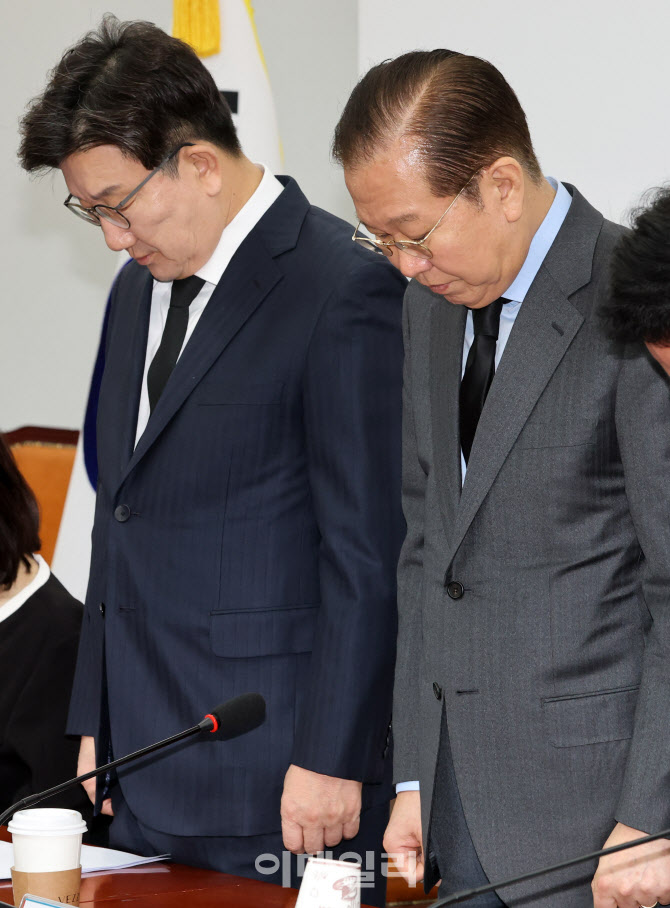 [이데일리 방인권 기자] 권영세 국민의힘 비상대책위원장(오른쪽)과 권성동 원내대표가 27일 서울 여의도 국회에서 열린 비상대책위원회의에 앞서 산불 희생자들을 추모하는 묵념을 하고 있다. |