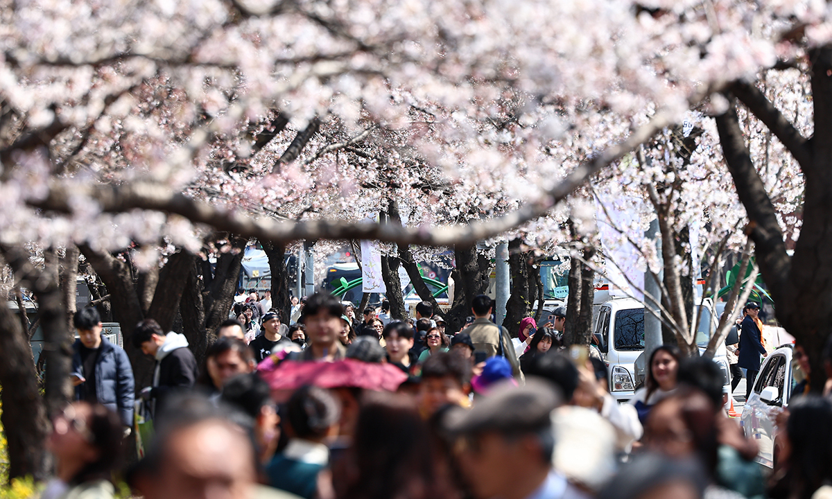 6일 오후 서울 영등포구 여의도 윤중로를 찾은 시민들이 개화한 벚꽃을 감상하며 봄기운을 만끽하고 있다. 뉴스1 |