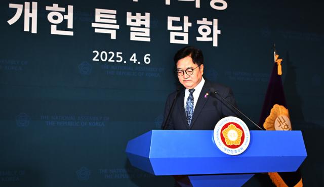 우원식 국회의장이 6일 국회 사랑재에서 긴급 기자회견을 열고 조기대선과 동시에 개헌이 필요하다고 주장했다. 다만 그는 개헌을 위한 국민투표를 위해 "헌법불합치 판정을 받은 재외국민 투표권 조항을 개정해야 한다"고 강조했다.