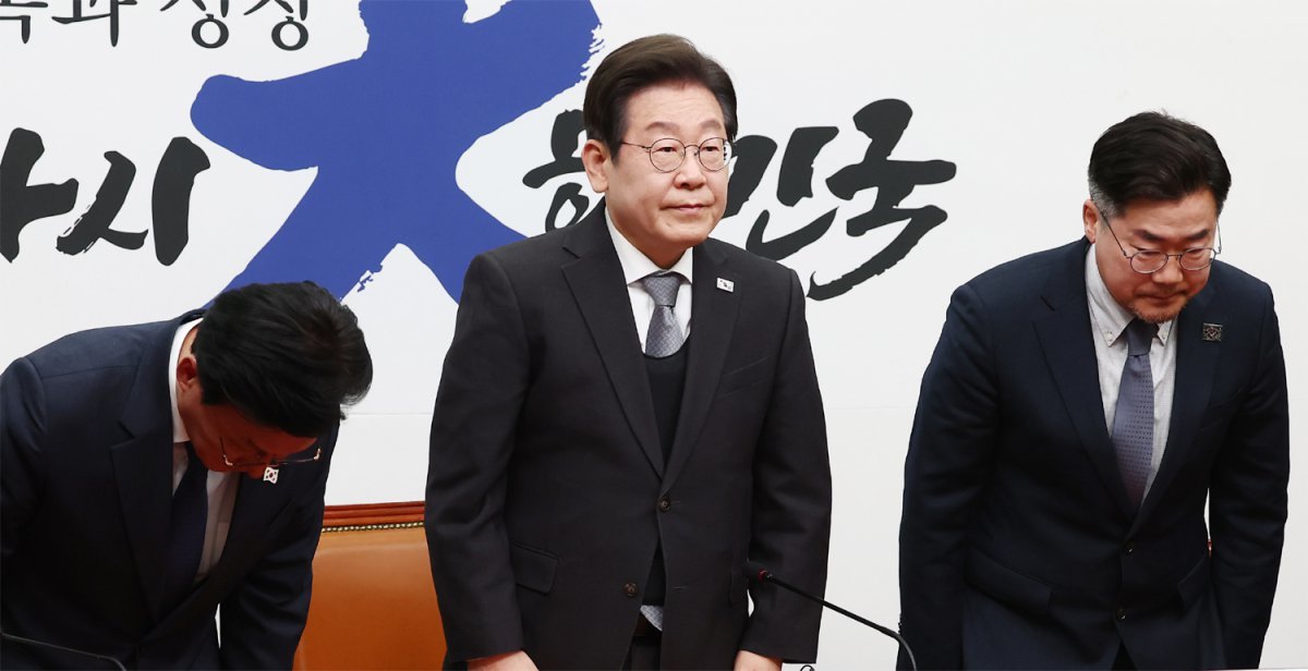 더불어민주당 이재명 대표가 4일 윤석열 전 대통령에 대한 헌법재판소의 파면 선고 직후 국회에서 입장을 발표한 뒤 인사하고 있다. 이 대표는 “위대한 국민들이 위대한 민주공화국 대한민국을 되찾아주셨다”며 “이제부터 진짜 대한민국이 시작될 것”이라고 했다. 이 대표 오른쪽은 박찬대 원내대표, 왼쪽은 김민석 최고위원. 뉴스1 |