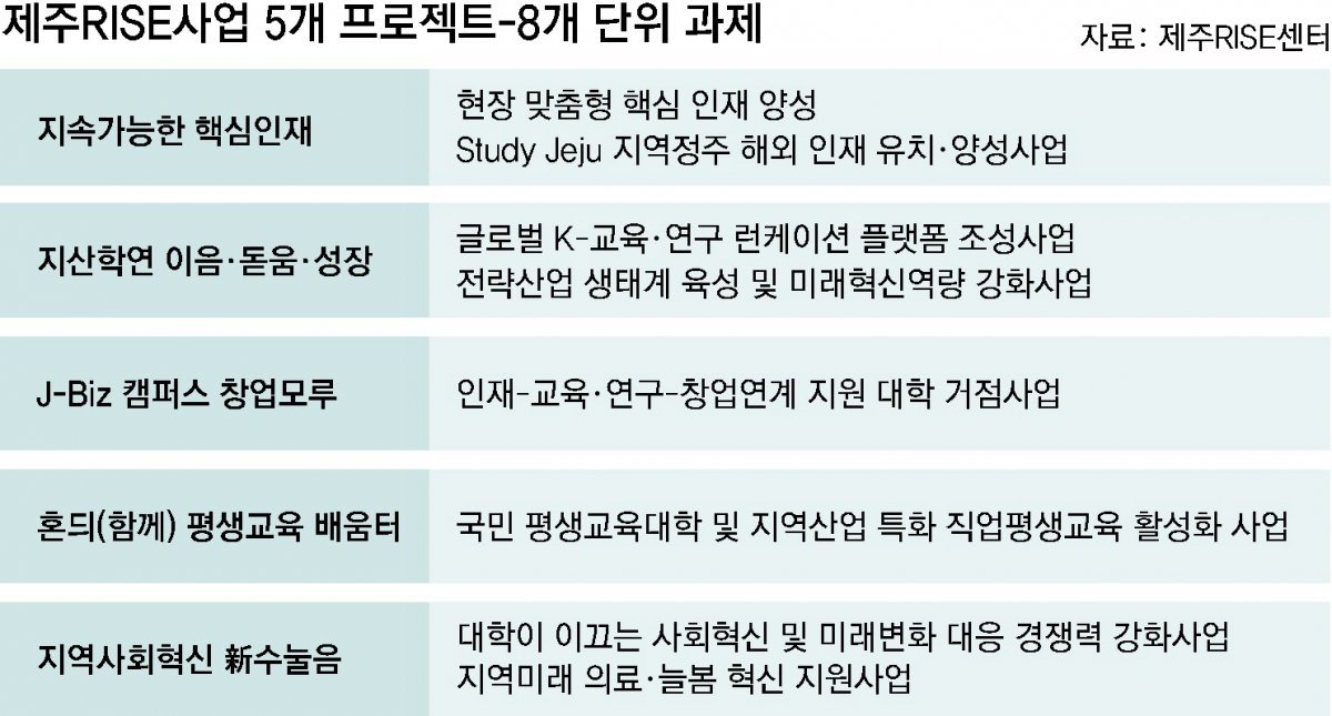 대표 사업으로는 ‘글로벌 K-교육·연구 런케이션 플랫폼 조성 사업’이 추진된다. 런케이션은 학습(Learning)과 휴식(Vacation)을 결합한 개념으로 제주를 거점으로 국내외 대학과의 공동 교육·연구 프로그램을 운영해 국제 교류와 연구 역량을 동시에 강화하겠다는 계획이다. 이 밖에도 ‘지속가능한 핵심 인재 양성’ ‘지산학연(지자체-산업-대학-연구기관) 연계 생태계 조성’ ‘제이비즈(J-Biz) 캠퍼스 창업 모루(마루)’ ‘혼듸(함께) 평생학습 배움터’ ‘지역사회혁신 신(新) 수눌음’ 등 지역 맞춤형 프로젝트도 함께 추진한다.