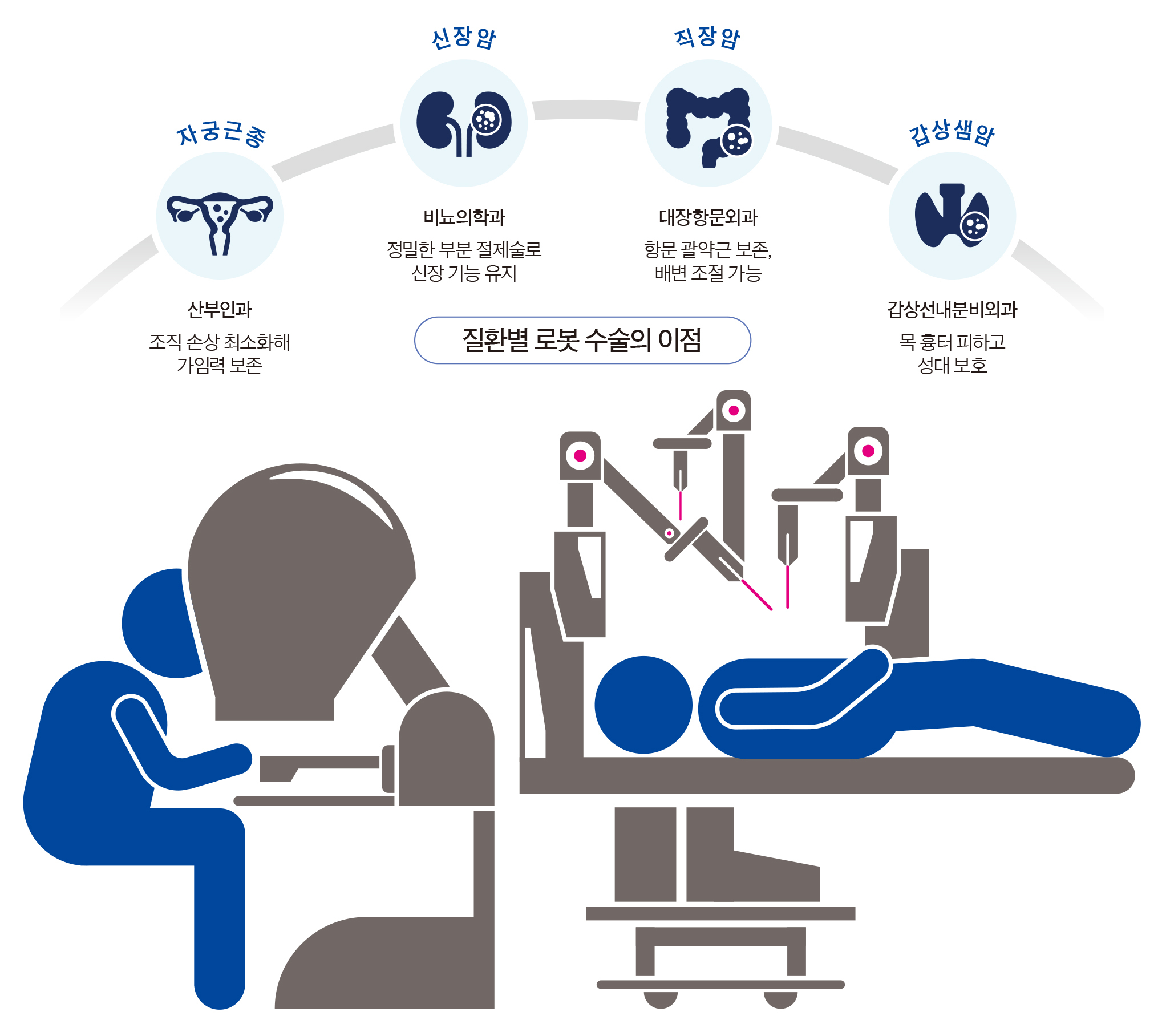 산부인과 김미란·이근호 교수가 대표적이다. 이들은 각각 자궁근종과 부인암에 로봇 수술을 적용해 환자의 가임력 보존을 돕는다. 자궁근종 발생 시 정밀한 절제와 촘촘한 봉합으로 자궁 조직을 보호하고 임신 중 자궁 파열 위험을 낮추는 식이다. 김미란 교수는 2019년 11월 아시아 최초로 로봇 자궁근종 절제술 1000건을 달성하기도 했다.