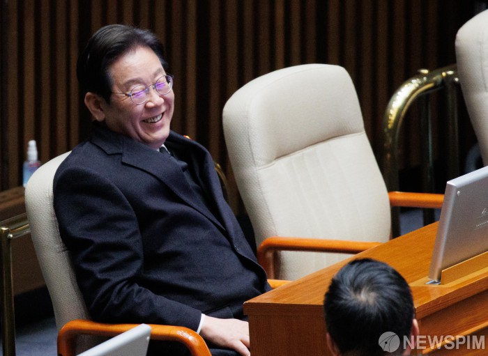 [서울=뉴스핌] 윤창빈 기자 = 이재명 더불어민주당 대표가 3일 오후 서울 여의도 국회 본회의장에서 열린 경북·경남·울산지역 산불 사태 수습과 피해대책 마련 및 헌법질서 수호를 위한 긴급현안질문에서 미소를 짓고 있다. 2025.04.03 pangbin@newspim.com |