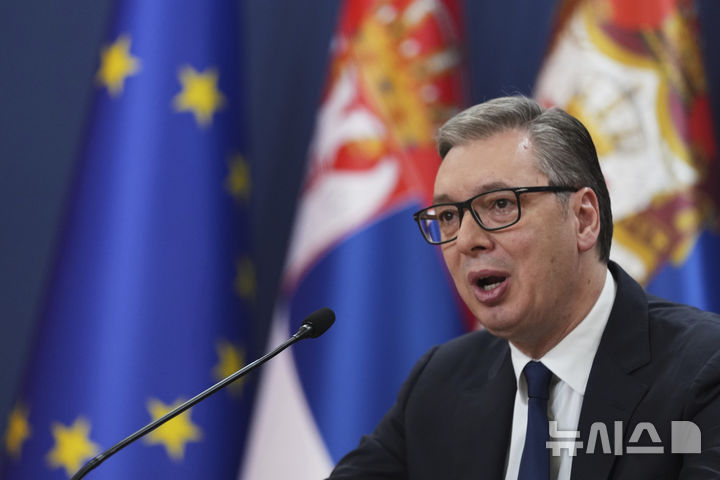 [베오그라드( 세르비아)=AP/뉴시스] 세르비아의 알렉산다르 부치치 대통령이 4월 6일 새 내각을 구성하고 신임 총리에 의대교수인 주르 마쿠브(62)를 임명한다고 발표하고 있다. 2025. 04.07. |