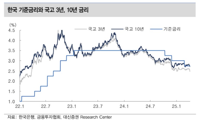 미국의 시장금리 하락은 일제히 국내에도 영향을 미쳐 국고 3년 금리가 이미 기준금리가 한 차례 더 인하된 수준인 2.50%를 밑돌고, 국고 10년 금리도 현 기준금리인 2.75% 아래로 떨어졌다. 기준금리와 시장금리 간의 역전이 일부 만기 구간에도 나타나고 있다.
