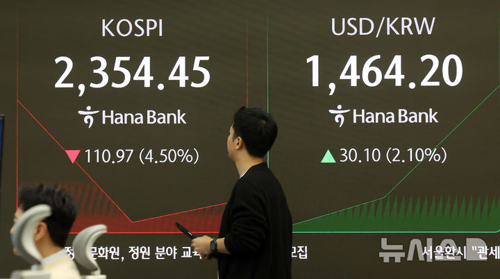 [서울=뉴시스] 홍효식 기자 = 코스피가 전 거래일(2465.42)보다 106.17포인트(4.31%) 급락한 2359.25에 개장한 7일 오전 서울 중구 하나은행 딜링룸 전광판에 지수가 표시되고 있다.코스닥 지수는 전 거래일(687.39)보다 20.37포인트(2.96%) 내린 667.02에 거래를 시작했다. 서울 외환시장에서 원·달러 환율은 전 거래일 주간거래 종가(1434.1원)보다 27.9원 급등한 1462.0원에 출발했다. 2025.04.07. yesphoto@newsis.com |