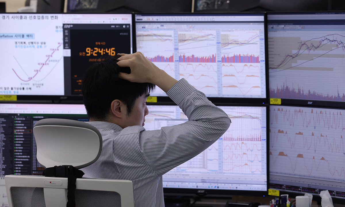 7일 서울 중구 하나은행 본점 딜링룸에서 직원이 업무를 보고 있다. 뉴스1 |