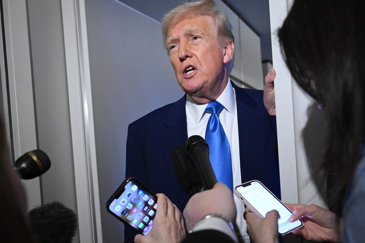 도널드 트럼프 미국 대통령이 6일(현지시간) 전용기 에어포스원에서 취재진과 이야기를 나누고 있다. [AFP] |