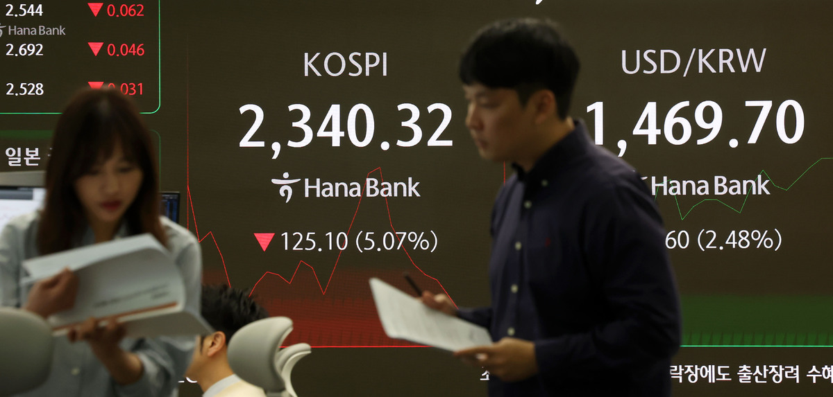 코스피가 전 거래일(2465.42)보다 106.17포인트(4.31%) 급락한 2359.25에 개장한 7일 오전 서울 중구 하나은행 딜링룸 전광판에 지수가 표시되고 있다. 뉴시스 |