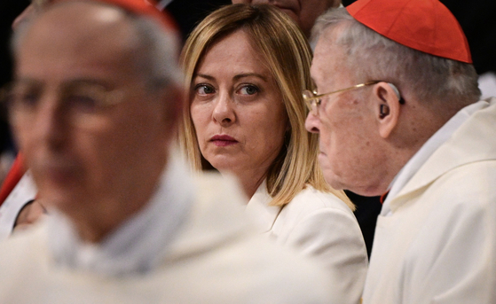지난 2일 바티칸에서 열린 교황 요한 바오로 2세 선종 20주년 기념 미사에 참석한 조르자 멜로니 이탈리아 총리. AFP=연합뉴스 |