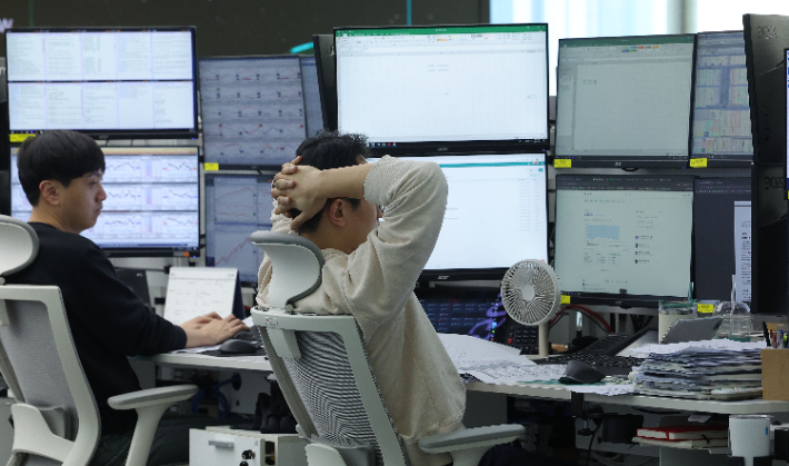 코스피가 전장보다 137.22p(5.57%) 내린 2328.20로 마감한 7일 오후 서울 중구 하나은행 딜링룸에서 딜러들이 업무를 보고 있다. 연합뉴스 |