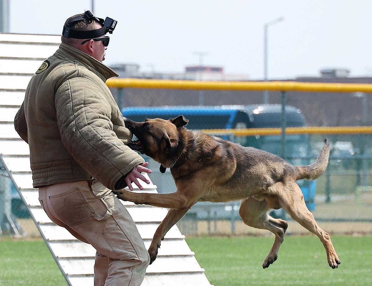 7일 경기 평택 주한미군기지 캠프 험프리스에서 열린 주한미연합군견반 군견 경진대회에 참가한 미국군 군견이 경연을 펼치고 있다. 주한미군 주최로 열린 이번 대회엔 한국군 군견 부대 등도 출전했다.