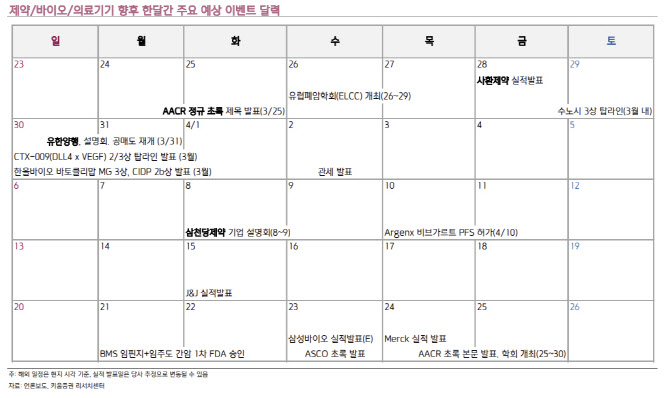 이 외에도 세계 3대 암학회 중 으뜸으로 꼽는 미국임상종양학회(ASCO) 초록도 내달 23일부터 공개된다. 지난해 유한양행(000100)·오스코텍(039200)의 렉라자(레이저티닙) 수준의 임상 발표 여부가 관전 포인트다. 23일 삼성바이오로직스(207940)가 실적발표를 예정하고 있다.