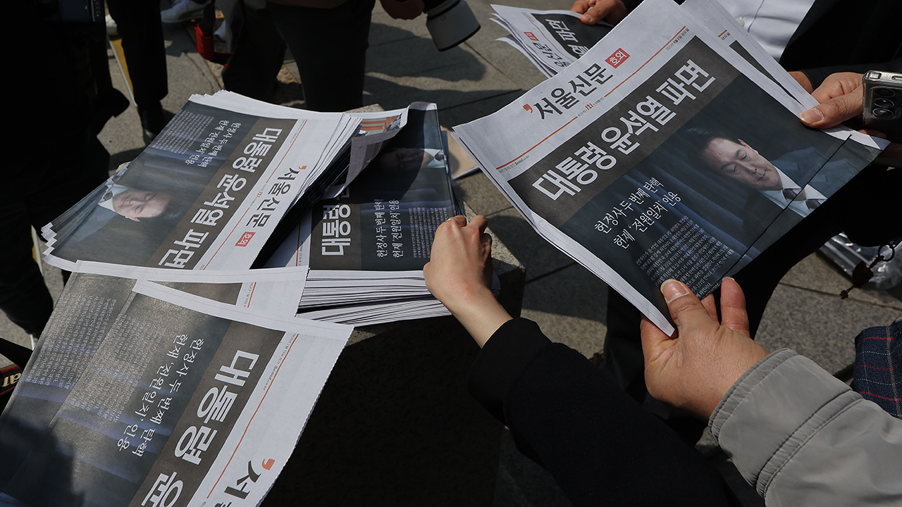 ▲ 헌법재판소가 윤석열 전 대통령 탄핵 사건에 대해 인용을 선고한 4일 서울 중구 지하철 시청역 출입구에서 시민들이 선고 소식을 실은 신문 호외를 보고 있다.