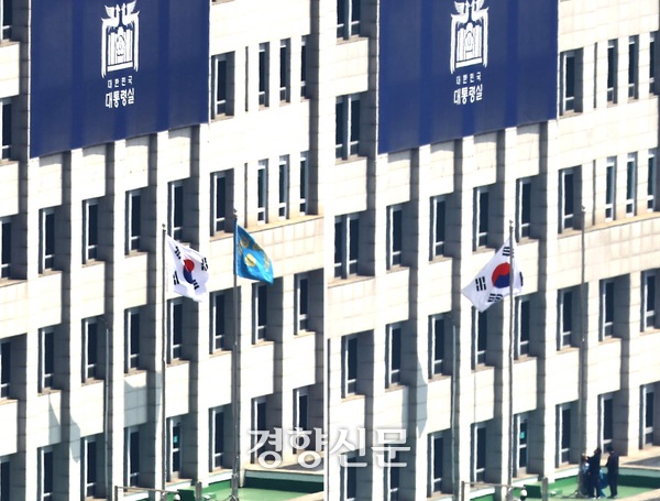 지난 4일 헌법재판소의 윤석열 대통령 파면 결정이 내려지자 용산 대통령실 청사 앞 봉황기가 내려지고 있다. 사진공동취재단 |