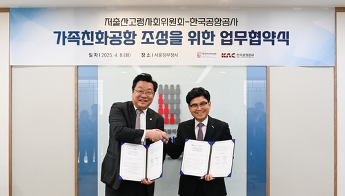 ▲ 저출산고령사회위원회와 한국공항공사는 8일 정부서울청사에서 가족친화 공항 조성을 위한 업무협약을 체결했다고 밝혔다. 협약을 계기로 양측은 우선 출국 서비스 등 임산부·영유아 동반·다자녀 가구 우대 제도를 도입하고 공사 내 양육 친화적 환경을 조성할 계획이다. 저출산위는 임산부 등 서비스 대상자가 공사 소속 전국 14곳 공항을 편리하게 이용하고, 사회적으로 이들을 우대하는 분위기가 조성될 것으로 기대했다. (서울=연합뉴스)