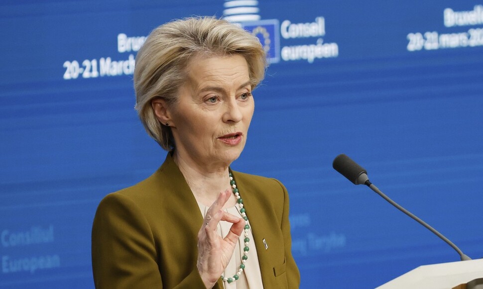 우르줄라 폰데어라이엔 유럽연합 집행위원회 위원장이 2025년 3월20일 벨기에 브뤼셀에서 열린 유럽연합 정상회의가 끝난 후 미디어 회견에서 연설하고 있다. AP 연합뉴스 |