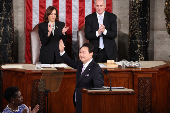 윤석열 전 대통령이 2023년 4월 27일(현지시간) 미국 워싱턴DC 의사당에서 미 상·하원 합동 연설을 하는 모습. [연합뉴스] |