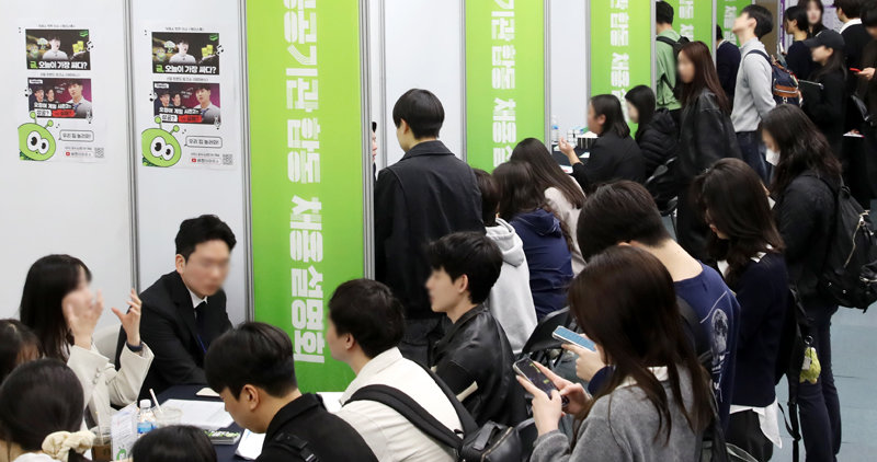 8일 부산 연제구 부산시청에서 열린 ‘2025 지역인재 공공기관 합동 채용설명회’에서 구직자들이 채용 상담을 받고 있다. 이번 채용설명회에는 부산 혁신도시 이전 공공기관을 비롯해 시 산하 공공기관, 금융·유관 기관 등 27개 기관이 참여했다.