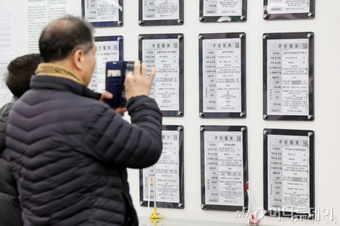 19일 서울 마포구 서부고용복지플러스센터에서 머리가 장년(長年)층 구직자가 일자리 정보 게시판을 살펴보고 있다. /사진=뉴스1 |