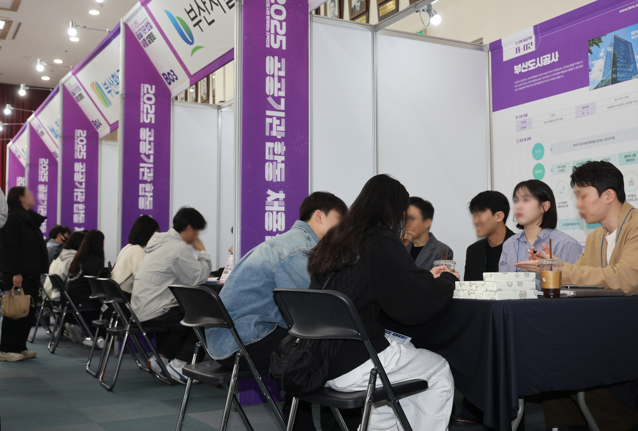 부산 혁신도시와 함께하는 ‘2025 지역인재 공공기관 합동 채용설명회’가 열린 8일 부산시 연제구 시청 대회의실에서 참가 취업준비생들이 공공기관 부스에서 진로 및 취업지도 상담하고 있다. [연합] |