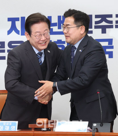 이재명 더불어민주당 대표가 9일 오전 서울 여의도 국회에서 열린 최고위원회의를 마친 후 박찬대 원내대표와 포옹하고 있다. 이재명 대표는 이날 회의를 끝으로 대표직을 사퇴했다. (사진=노진환 기자) |