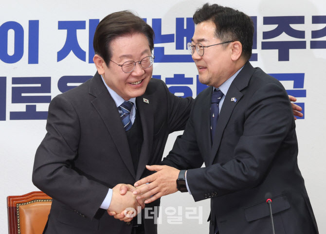 [이데일리 노진환 기자] 이재명 더불어민주당 대표가 9일 오전 서울 여의도 국회에서 열린 최고위원회의를 마치며 김민석 최고위원과 악수하고 있다. 이재명 대표는 이날 회의를 끝으로 당대표직을 내려놓았다. |