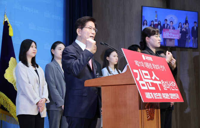 김 전 장관은 이날 오전 국회 소통관에서 대선 출마 기자회견을 갖고 “거짓과 감언이설로 대한민국을 혼란과 파멸로 몰고 갈 이재명의 민주당은 저 김문수가 확실히 바로 잡겠다”며 이같이 말했다. 김 전 장관은 각종 여론조사에서 보수 진영내 차기 대선 주자 선호도 1위를 달리고 있는 후보다.