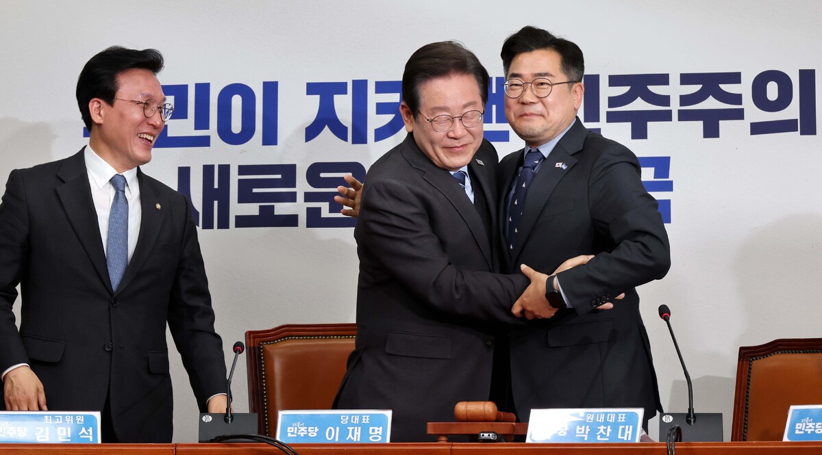 더불어민주당 이재명 대표가 9일 서울 여의도 국회에서 열린 최고위원회의에서 대표직 사퇴 의사를 밝힌 뒤 김민석 최고위원과 포옹하고 있다. |