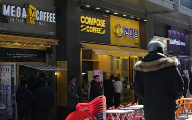 저가 커피 프랜차이즈 가맹점이 밀집한 서울 종로구 한 상가 앞으로 올해 2월 21일 시민들이 걸어가고 있다. 연합뉴스 |