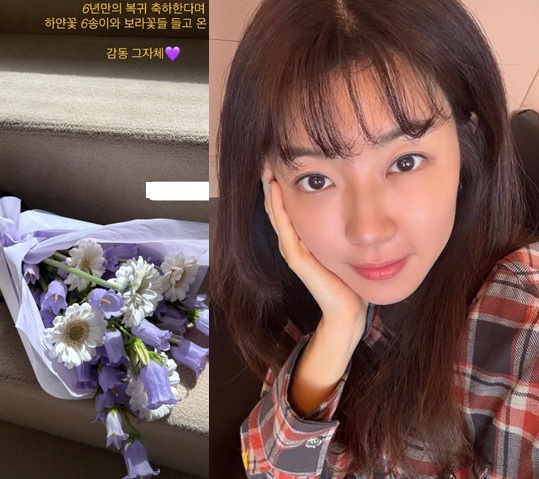 8일 박한별은 "6년만의 복귀 축하한다며 하얀 꽃 6송이와 보라 꽃을 들고 온 요가쌤. 감동 그 자체♥"라는 글과 함께 자신이 받은 꽃다발을 자랑했다.