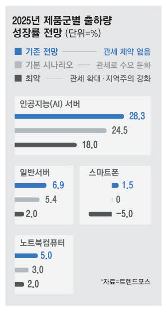 미국의 관세 정책이 글로벌 공급망을 흔들 가능성이 커지면서 주요 IT 제품군의 올해 출하량 전망이 일제히 하향 조정됐다. 최악의 경우 AI 서버 성장률은 10%포인트 이상 떨어지고, 스마트폰은 역성장할 것이란 관측까지 나온다.