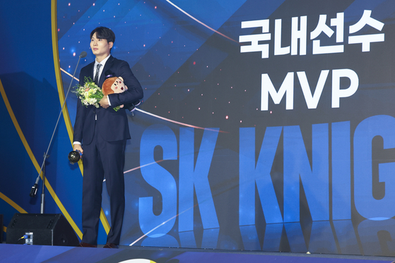안영준은 9일 서울 강남구 그랜드 인터컨티넨탈 서울 파르나스에서 열린 2024~25시즌 정규리그 시상식에서 기자단 총투표수 111표 중 89표를 얻어 최우수선수(MVP)에 올랐다. 안영준은 경기당 평균 33분을 뛰며 14점 5.9리바운드 2.7어시스트를 기록했다. 안영준과 MVP를 두고 경쟁한 같은 팀 선배 김선형(37)은 19표로 2위에 올랐다.