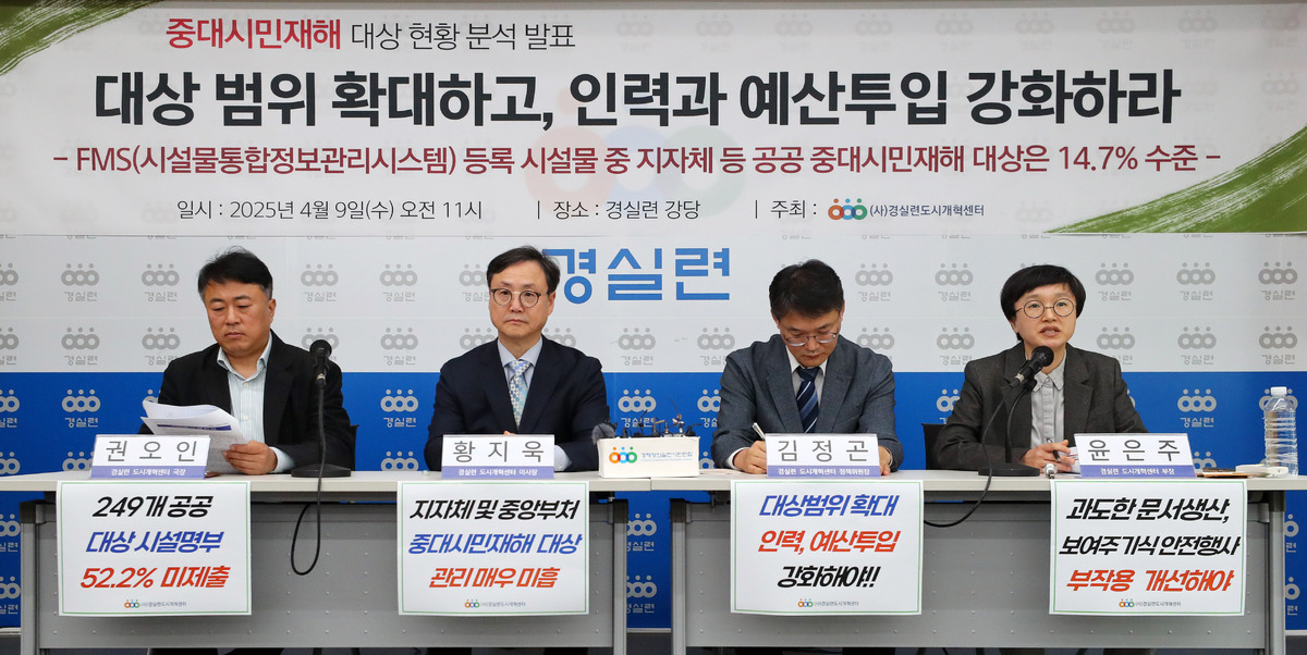 경실련은 ‘무안공항 제주항공 여객기 참사’ ‘서울 강동구 싱크홀 사고’ ‘창원 NC파크 구조물 낙하 사고’ 등 최근 재해를 거론하며 정부와 지방자치단체의 역할론을 부각했다.