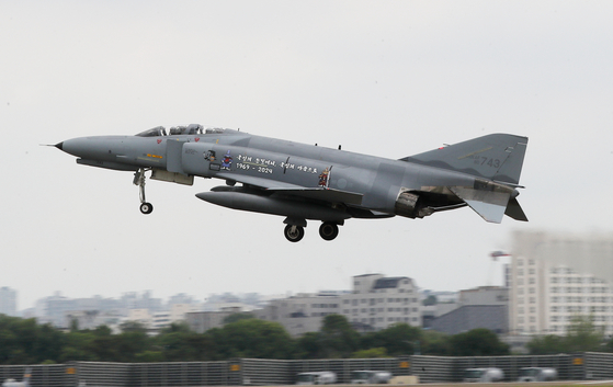 퇴역을 보름여 앞둔 공군 F-4E 팬텀 전투기가 20일 경기 수원시 공군 제10전투비행단에서 이륙을 하고 있다. 뉴스1 |