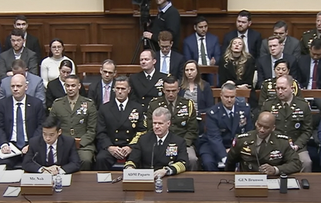 미국 존 노 국방부 인도·태평양 안보 담당 차관보 대행(왼쪽부터)·새뮤얼 파파로 인도·태평양 사령관·제이비어 브런스 주한미군 사령관이 9일(현지시간) 미국 워싱턴 D.C. 연방의회 의사당에서 진행된 하원 군사위원회 청문회에서 증언하고 있다./청문회 영상 캡처 |