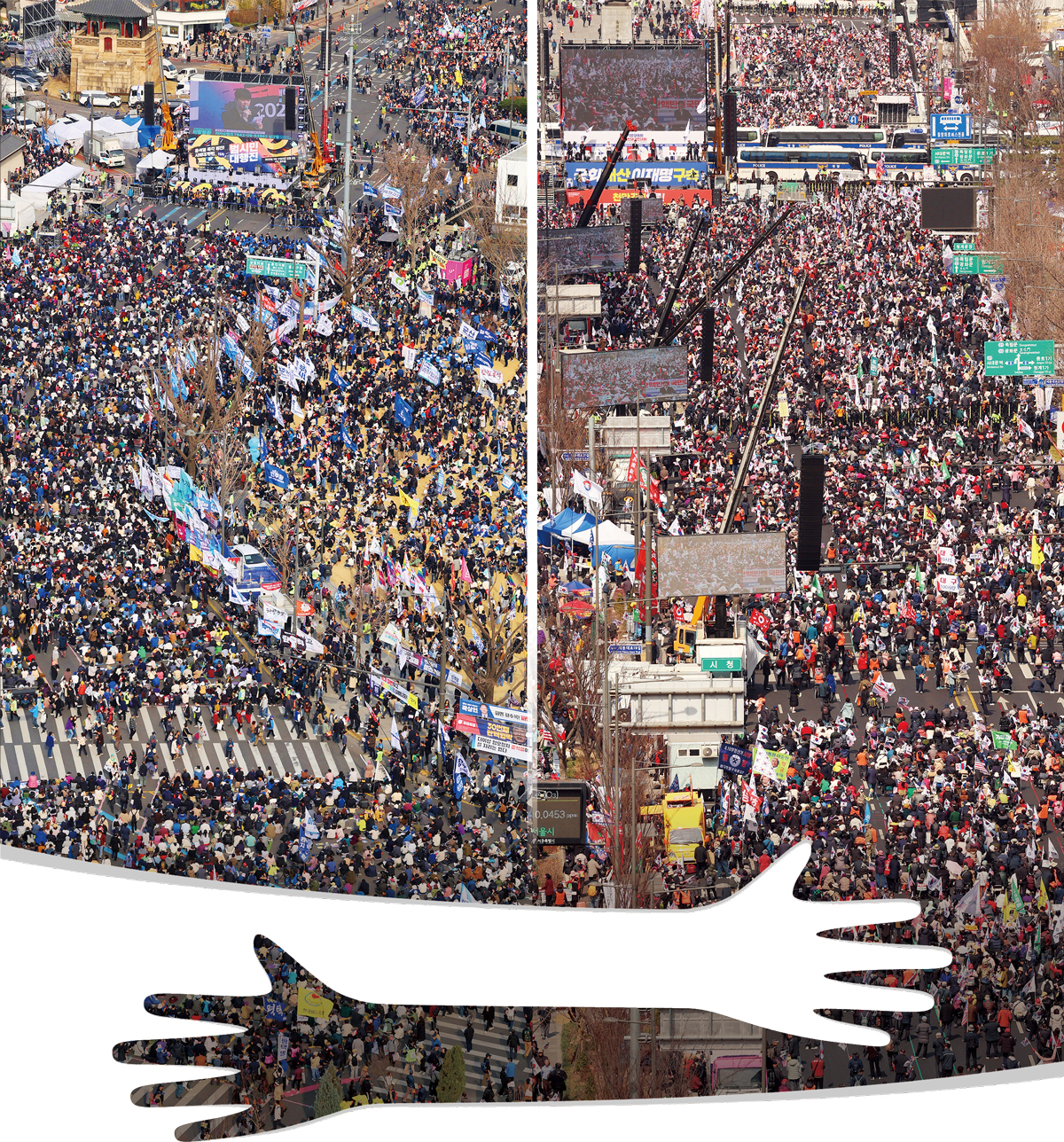 서울 광화문에서 지난달 15일 윤석열 전 대통령의 탄핵에 찬성하는 시민들(왼쪽)과 탄핵에 반대하는 시민들이 각각 집회를 하고 있다. 전문가들 사이에서는 6·3 조기 대선에서 정치권이 국민 통합을 이뤄야 한다고 조언이 나온다. 뉴스1 |