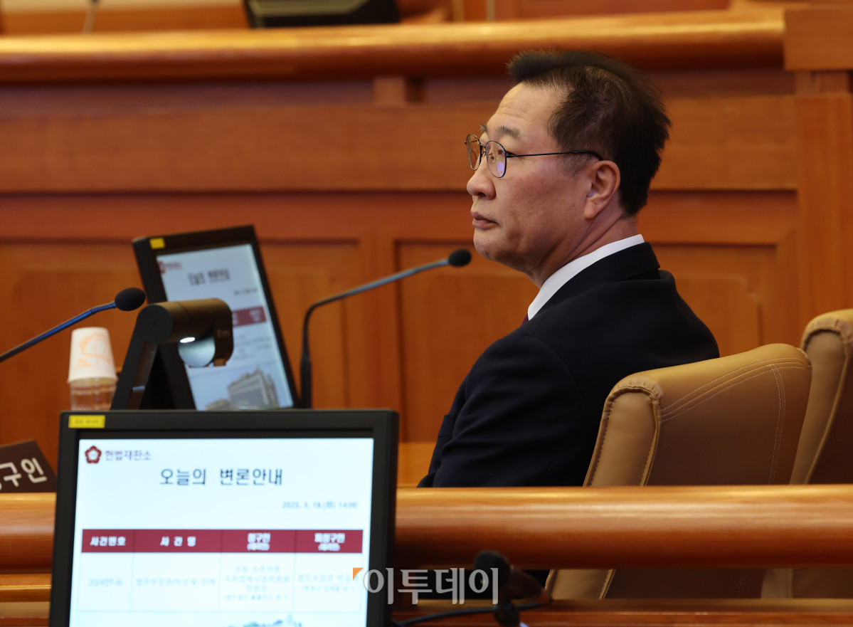 박성재 법무부 장관이 지난달 18일 서울 종로구 헌법재판소 대심판정에서 열린 탄핵심판 1회 변론에 출석해 있다. 조현호 기자 hyunho@ |