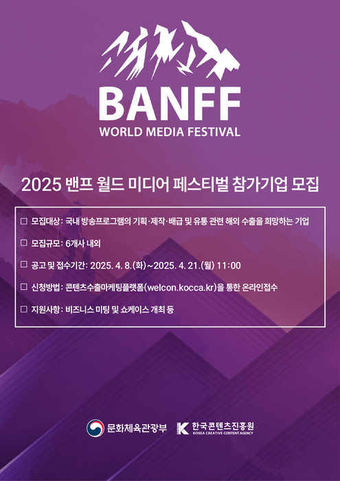 한국콘텐츠진흥원은 6월 8일부터 11일까지 캐나다 밴프에서 열리는 '2025 밴프 월드 미디어 페스티벌' 행사에 참가할 국내 콘텐츠기업은 오는 4월 21일까지 모집한다. |