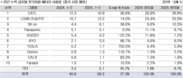 SK온은 시장 평균 성장률(27.3%)을 상회한 38.6% 성장하며 3위에 올랐다. 현대차그룹으로의 탑재량이 최대로 작용한 가운데, 메르세데스 벤츠·폭스바겐 등으로의 판매량 호조가 이어지면서 성장세를 탔다.