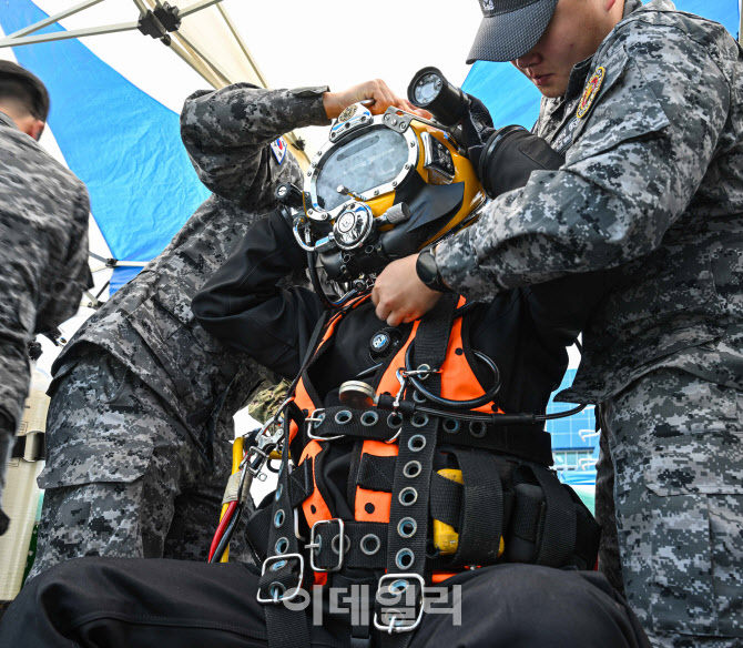 8일 경남 창원시 진해만 일대에서 진행된 한미 해군 연합 구조전 훈련에서 한국 해군 심해잠수사가 표면공급잠수체계(SSDS) 장비를 착용하고 있다. (사진=해군) |
