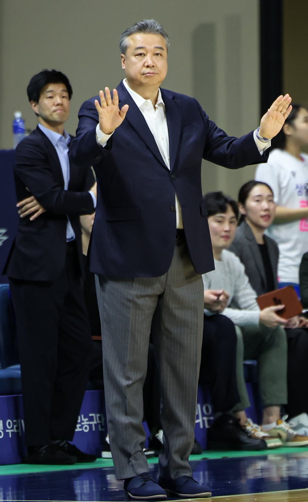 임근배 전 삼성생명 감독이 삼성 남녀 농구단을 이끌 새 단장에 선임됐다. 사진은 임 단장이 삼성생명 감독 시절인 2024년 우리은행 전에서 경기를 지휘하는 모습. 당시 하상윤(뒤쪽 왼편) 코치는 이번 시즌부터 지휘봉을 잡았다. /뉴스1 |