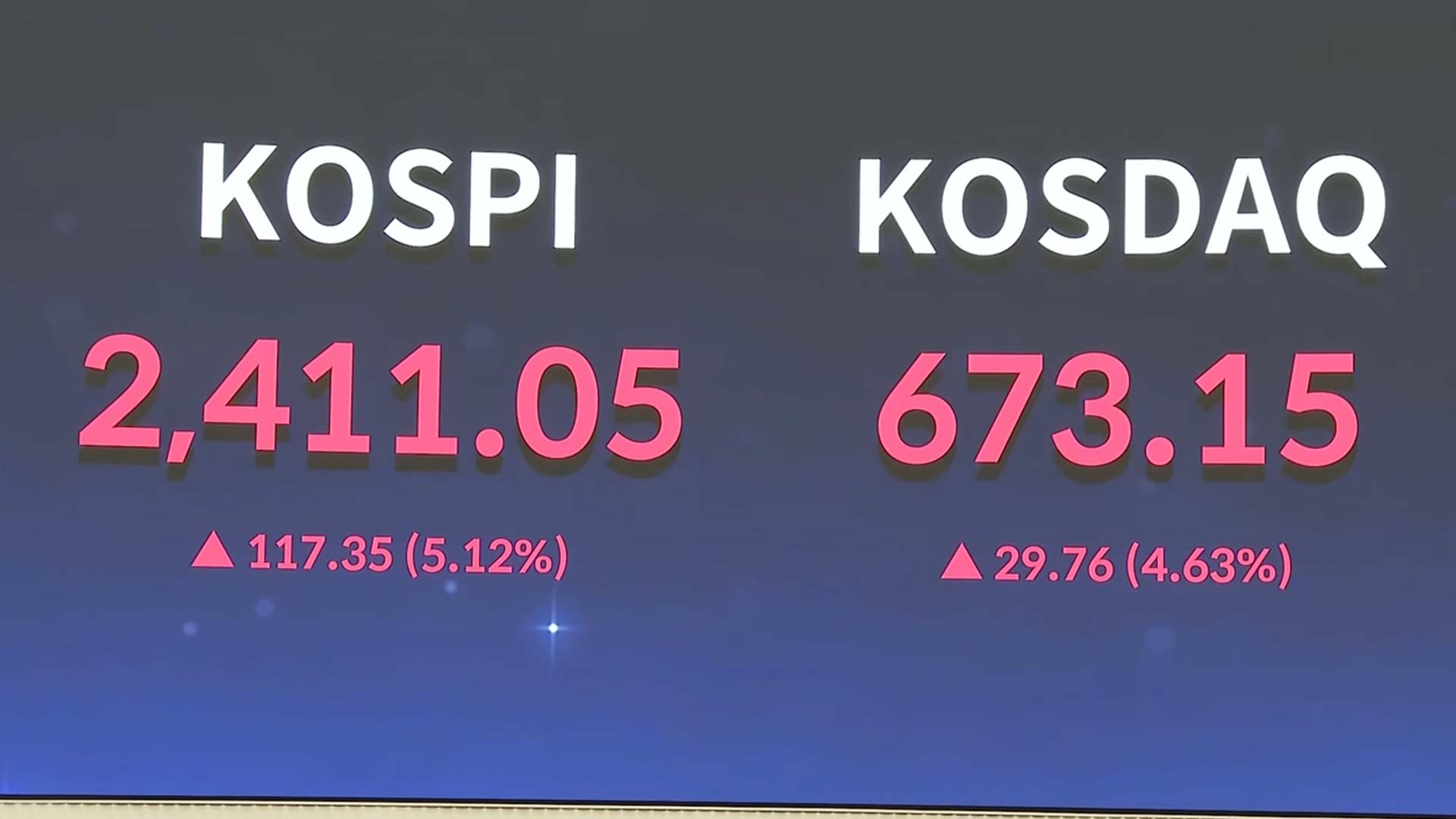 코스피는 전 거래일보다 4.42% 오른 채 개장해, 현재는 5% 이상 상승폭을 넓혀 2,400선을 웃돌고 있습니다.