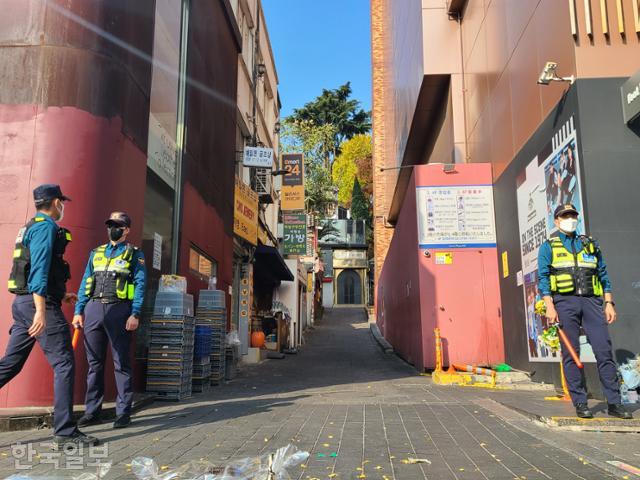 2022년 11월 촬영된 서울 용산구 이태원 참사 현장. 도보 오른쪽에 해밀톤호텔 측에서 설치한 철제 패널(가벽)이 보인다. 이유진 기자 |