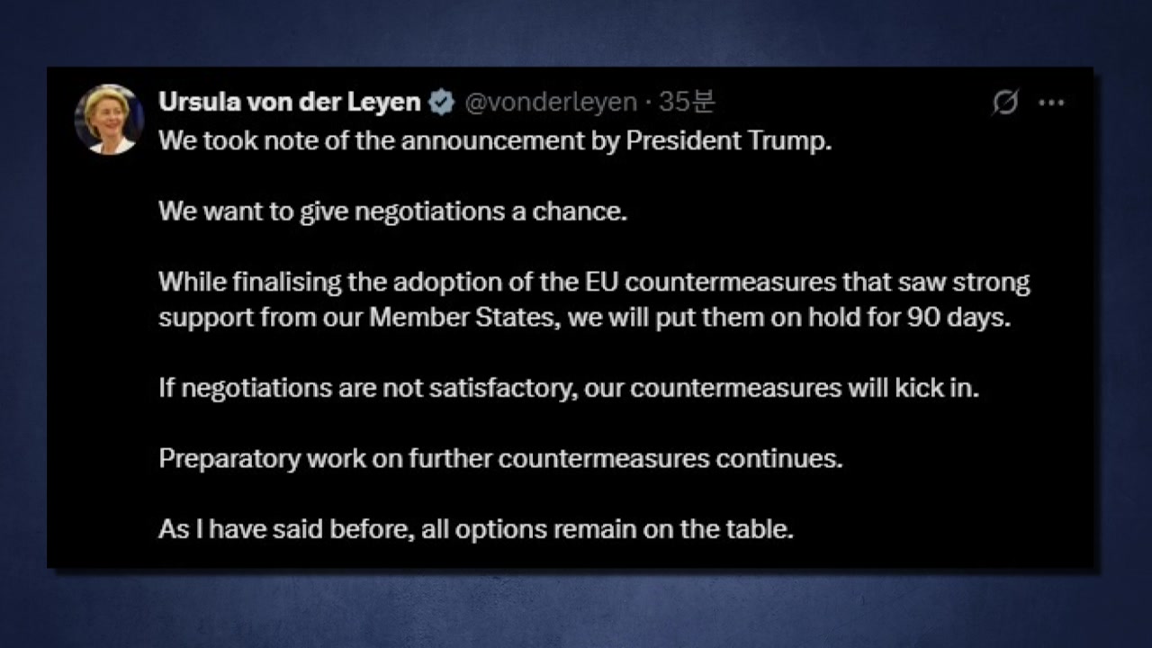 앞서 폰데어라이엔 집행위원장은 트럼프 대통령의 상호관세 유예 발표 후 "세계 경제 안정을 위한 중요한 결정"이라며 환영한다는 입장을 밝혔습니다.