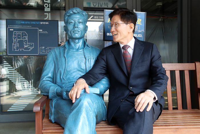 김문수 전 고용노동부 장관이 10일 서울 종로구 전태일기념관에 설치된 전태일 동상 옆에 앉아 있다. [사진출처 = 공동취재] |